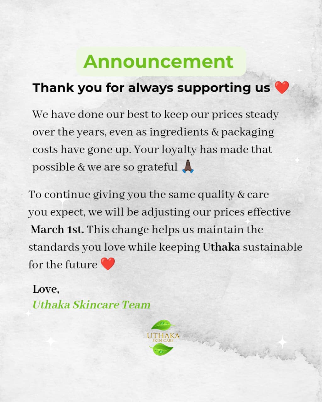 HANDMADE SKINCARE & BEAUTY PRODUCTS ORGANIC PRODUCTS SHOP NOW! BOUTIQUE ELEGANCE CLEANSE CLASSY FASHION HANDMADE UNIQUE BEAUTY DISCOVER 4 items Serums 5 items Moisturizers 1 item Clay Mask 2 items Toners 1 item Body Butters 5 items Soaps MOISTURISERS | TONERSUTHAKA'S SHOP CHOICE Quick View Moisturizers Add to wishlist Soothing Aloe Moisturizer with Aloe Vera & Jojoba Oil – Gentle Hydration for Sensitive Skin KSh 1,000.00 Add to cart Quick View Salicylic Acid Serum Add to wishlist Salicylic Acid Serum for Acne-Prone Skin – Deep Pore Cleansing & Oil Control KSh 1,200.00 Add to cart Quick View Face Moisturizers Add to wishlist Oil-Free Moisturizer with Rose Water – Lightweight Hydration for Glowing, Balanced Skin KSh 1,000.00 Add to cart Quick View Dark Spot Corrector Add to wishlist Dark Spot Corrector with Kojic Acid, Tranexamic and Alpha Arbutin KSh 1,500.00 Add to cart Quick View Moisturizers Add to wishlist Niacinamide Moisturizer – Oil Control, Hydration & Brightening for All Skin Types KSh 1,000.00 Add to cart Quick View Out of stock Face Moisturizers Add to wishlist Salicylic Acid Moisturizer – Acne Treatment & Skin Soothing Moisturizer KSh 1,000.00 Read more Recent Products Quick View Face Moisturizers Add to wishlist Oil-Free Moisturizer with Rose Water – Lightweight Hydration for Glowing, Balanced Skin KSh 1,000.00 Add to cart Quick View Moisturizers Add to wishlist Niacinamide Moisturizer – Oil Control, Hydration & Brightening for All Skin Types KSh 1,000.00 Add to cart Quick View Serums Add to wishlist Niacinamide Serum with Snail Mucin Extract – Brightening & Hydrating Serum for Glowing Skin KSh 1,200.00 Add to cart Quick View Soaps Add to wishlist African Black Soap KSh 350.00 Add to cart Quick View Soaps Add to wishlist Pure Goat Milk Soap – Nourishing and Moisturizing Soap for Soft, Glowing Skin KSh 400.00 Add to cart Quick View Serums Add to wishlist Alpha Arbutin & Tranexamic Acid Serum – Brightening Solution for Dark Spots and Hyperpigmentation KSh 1,200.00 Add to cart Quick View Toners Add to wishlist Pure Rose Water – Natural Hydrating Toner for Refreshing & Soothing Skin KSh 350.00 Add to cart Quick View Toners Add to wishlist Aloe Vera Gel for Redness, Dryness and Sunburn KSh 500.00 Add to cart SOAP | MASKSUTHAKA'S SHOP CHOICE Quick View Soaps Add to wishlist Pure Goat Milk Soap – Nourishing and Moisturizing Soap for Soft, Glowing Skin KSh 400.00 Add to cart Quick View Soaps Add to wishlist Tumeric and Honey Soap KSh 400.00 Add to cart Quick View Out of stock Clay Mask Add to wishlist Pure Bentonite Clay – Deep Cleansing Face Mask for Clear, Detoxified Skin KSh 500.00 Read more Quick View Soaps Add to wishlist Activated Charcoal Soap KSh 400.00 Add to cart Quick View Soaps Add to wishlist African Black Soap KSh 350.00 Add to cart Quick View Soaps Add to wishlist Kojic Acid Soap – Brightening Support for Dark Spots and Uneven Tone KSh 400.00 Add to cart BEST SELLING PRODUCTS Quick View Serums Add to wishlist Alpha Arbutin & Tranexamic Acid Serum – Brightening Solution for Dark Spots and Hyperpigmentation KSh 1,200.00 Add to cart Quick View Soaps Add to wishlist Tumeric and Honey Soap KSh 400.00 Add to cart Quick View Moisturizers Add to wishlist Niacinamide Moisturizer – Oil Control, Hydration & Brightening for All Skin Types KSh 1,000.00 Add to cart Quick View Dark Spot Corrector Add to wishlist Dark Spot Corrector with Kojic Acid, Tranexamic and Alpha Arbutin KSh 1,500.00 Add to cart Quick View Out of stock Face Moisturizers Add to wishlist Salicylic Acid Moisturizer – Acne Treatment & Skin Soothing Moisturizer KSh 1,000.00 Read more Quick View Body Butters Add to wishlist Raw Ugandan Shea Butter – Natural Moisturizer for Soft, Smooth Skin KSh 600.00 – KSh 900.00Price range: KSh 600.00 through KSh 900.00 Select options Quick View Out of stock Clay Mask Add to wishlist Pure Bentonite Clay – Deep Cleansing Face Mask for Clear, Detoxified Skin KSh 500.00 Read more Quick View Toners Add to wishlist Aloe Vera Gel for Redness, Dryness and Sunburn KSh 500.00 Add to cart Beauty Digest SKIN TYPES 21 March 2024 1 comment We Are Social uthakaskincare Vanilla Essential Oil 15ml-shs 700 30ml-shs 1200 #nairobismallbusiness #selfcarekenya #supportsma "Kojic Acid Soap:Brightens and beautifies!" 120g-s #smallbusinessnairobi #shopkenya #smallbusinessk Peppermint Essential Oil 15ml-shs 550 30ml-shs 960 African Black Soap 100g-shs 350 Pickup point Star Instagram